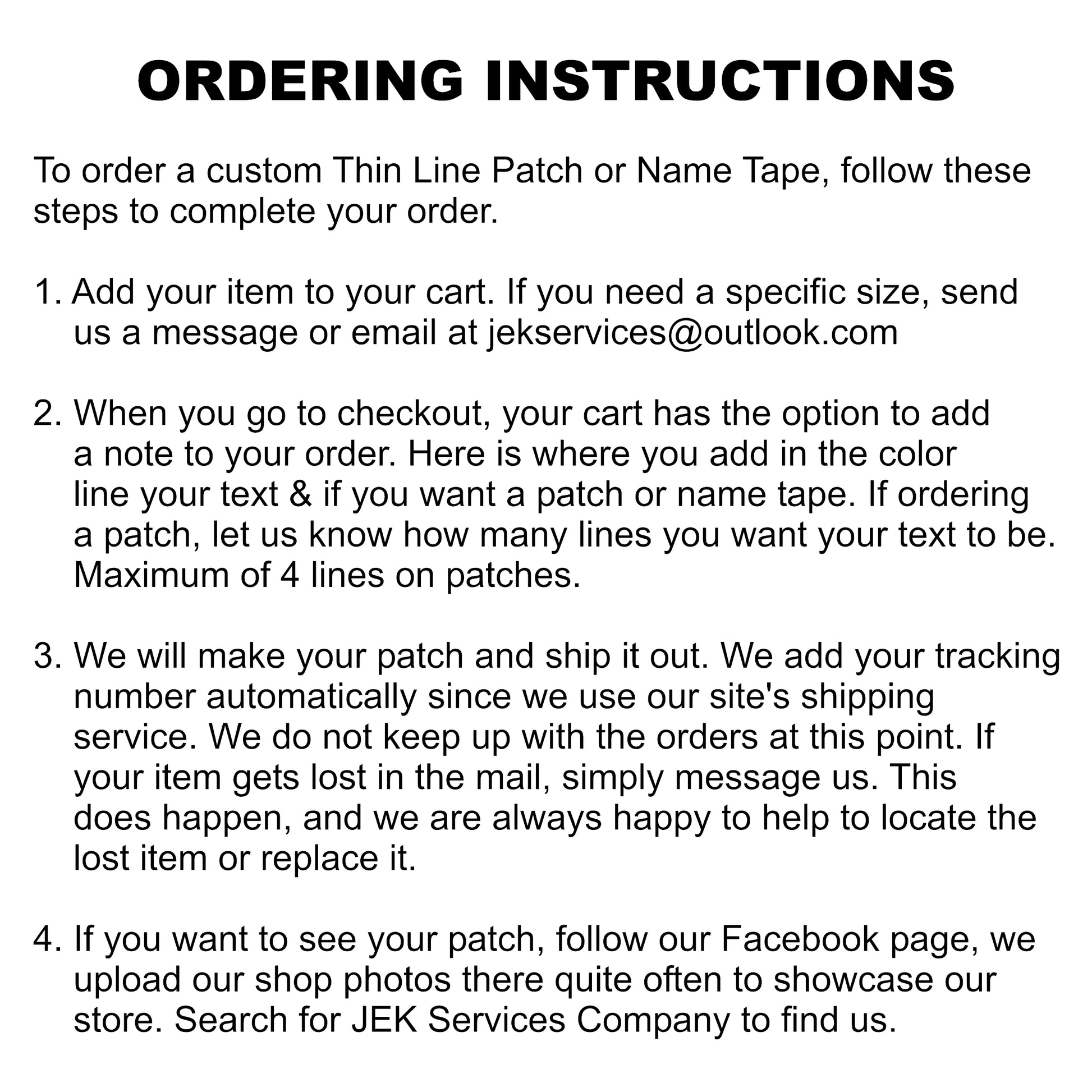 - Patch: approx. 3” wide × 2” tall, up to 4 lines of text